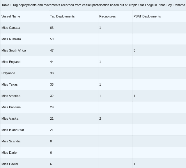 (TSL) in southwestern Panama. This work continues today and is funded in part by the Guy Harvey Ocean Foundation (GHOF). Through mid-March 2020, a total of 500 dolphin have been tagged and released by 21 vessels and approximately 154 anglers. This effort has led to the recovery of 14 dolphinfish in the Eastern Pacific Ocean (EPO) and the deployment of eight pop-up satellite archival transmitters. We recently received three recaptures reported by Captain Fernando Brias of Dios Primero, an artisanal fishermen based out of San Miguel Bay, that provided the first evidence of annual residents in Panama. In a recent longline set, three fish had tags, and of those, two were fish that were tagged and released by Miss Puerto Rico and Miss England off Piñas Bay, Panama, in January 2019.